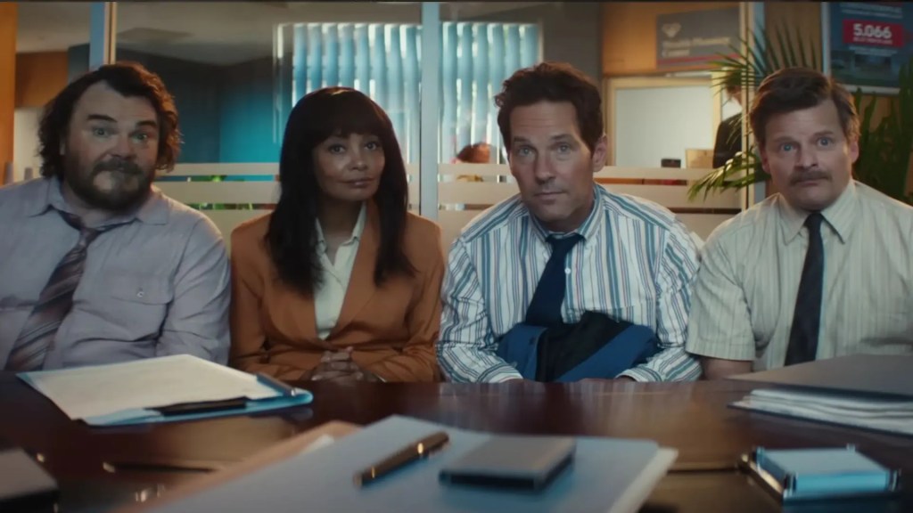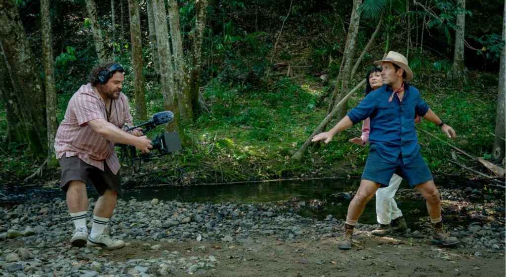 Director Tom Gormican, who made the Nicholas Cage meta epic The Unbearable Weight of Massive Talent, takes a similar approach to this reimagining. In the film, Doug (Black), Griff (Rudd), Kenny (Steve Zhan), and Claire (Thandiwe Newton) take to the jungles of the Amazon in the hopes of remaking the 90s big reptile shocker, only to find their production running into serious trouble when a real flesh eating serpent sets its sights on them and begins to pursue them through the jungle. As far as the story goes, that’s pretty much it.